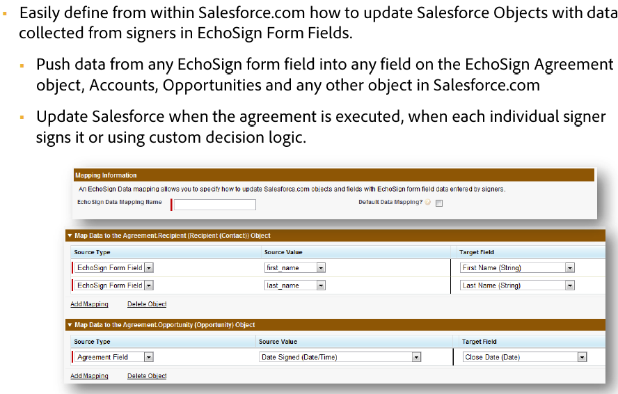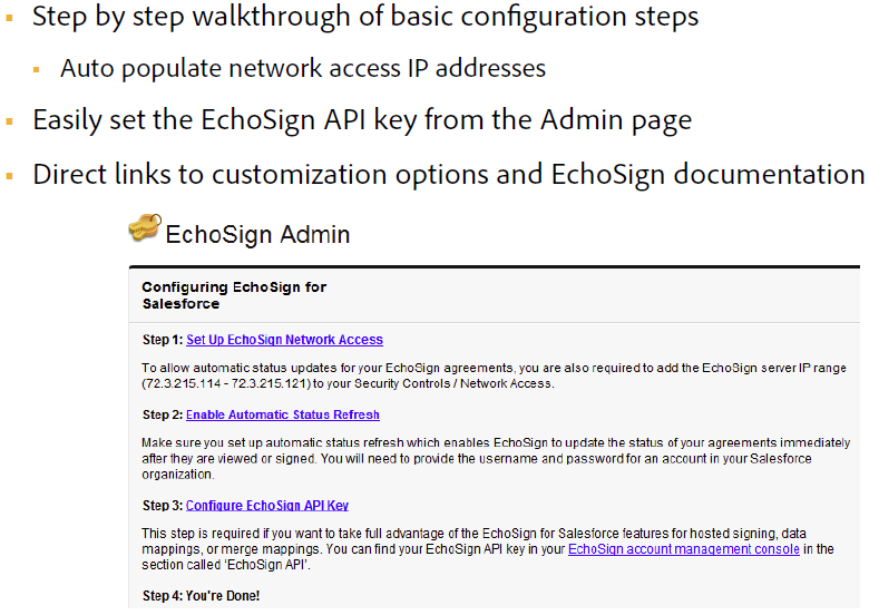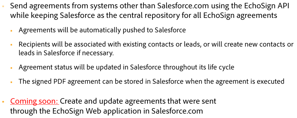Adobe EchoSign has been tested, validated and documented to integrate with Salesforce Identity, making it easier than ever for IT organizations to enable critical identity and access management features seamlessly and securely