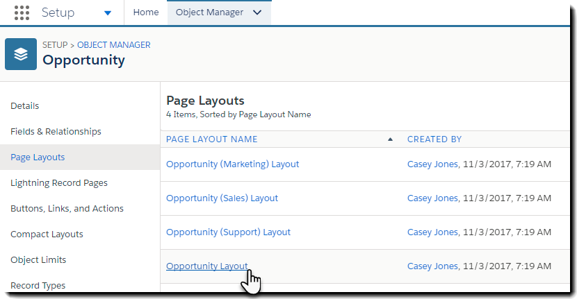 On the dialog that appears, select a page layout that you want to modify from the given options: Account, Opportunity, Contract, Lead, and Contact.