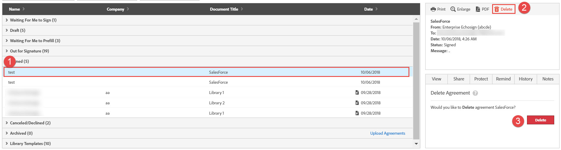 - Only the agreements, which are not actively in-process, can be deleted.