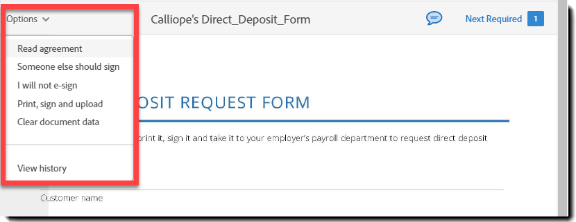 If the recipient who chose to Print the document returns to the Options menu before the agreement is downloaded, the Sign electronically option allows them to return to the electronic signature process.