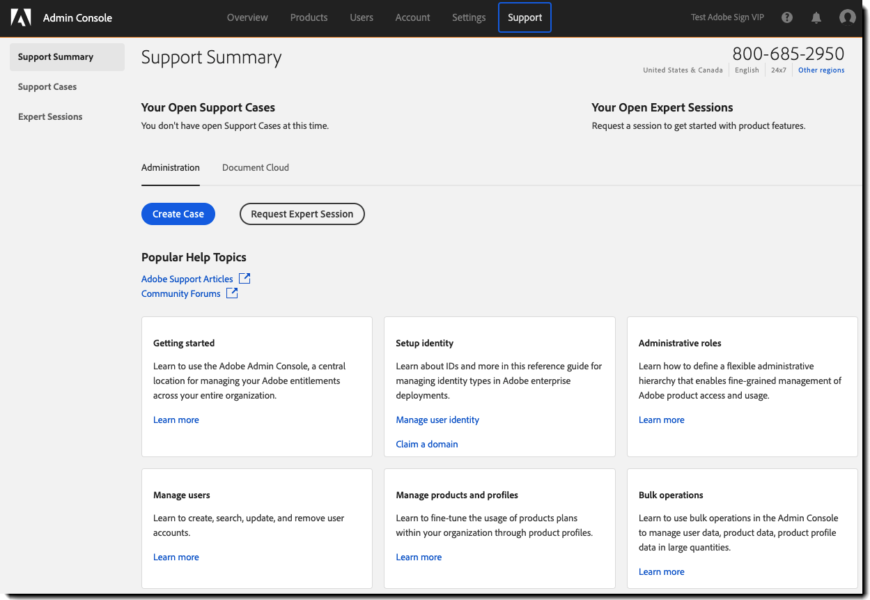 The Adobe Admin Console is the central location for entitling users to access Adobe products (like Acrobat Sign) and contacting support.