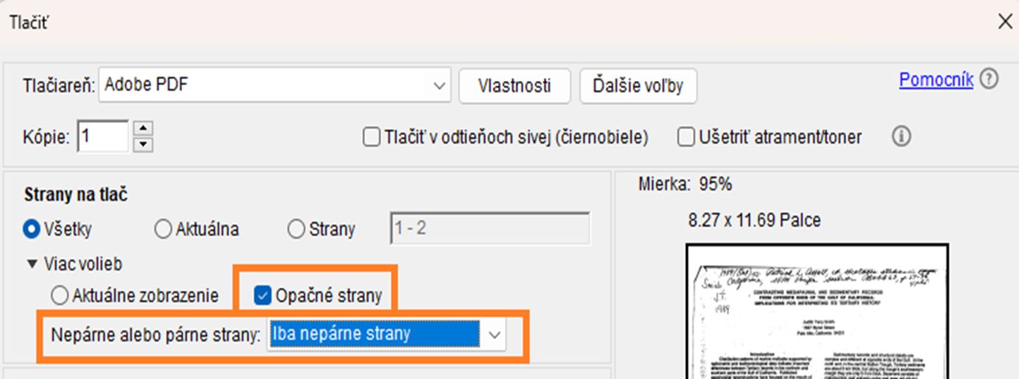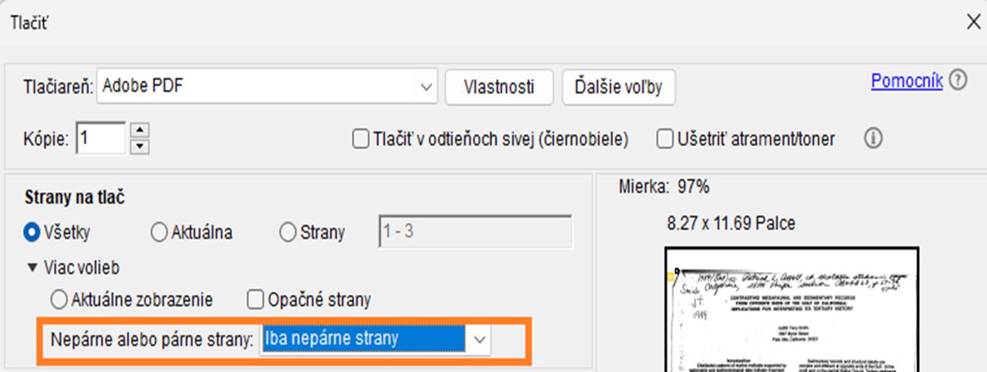 Vyberte ponuku s vodorovnými čiarami (Windows) alebo ponuku Súbor (macOS) > Tlač a v časti Strany na tlač v dialógovom okne Tlač vyberte položku Iba nepárne strany. (Teraz nevyberajte možnosť Otočiť strany.)