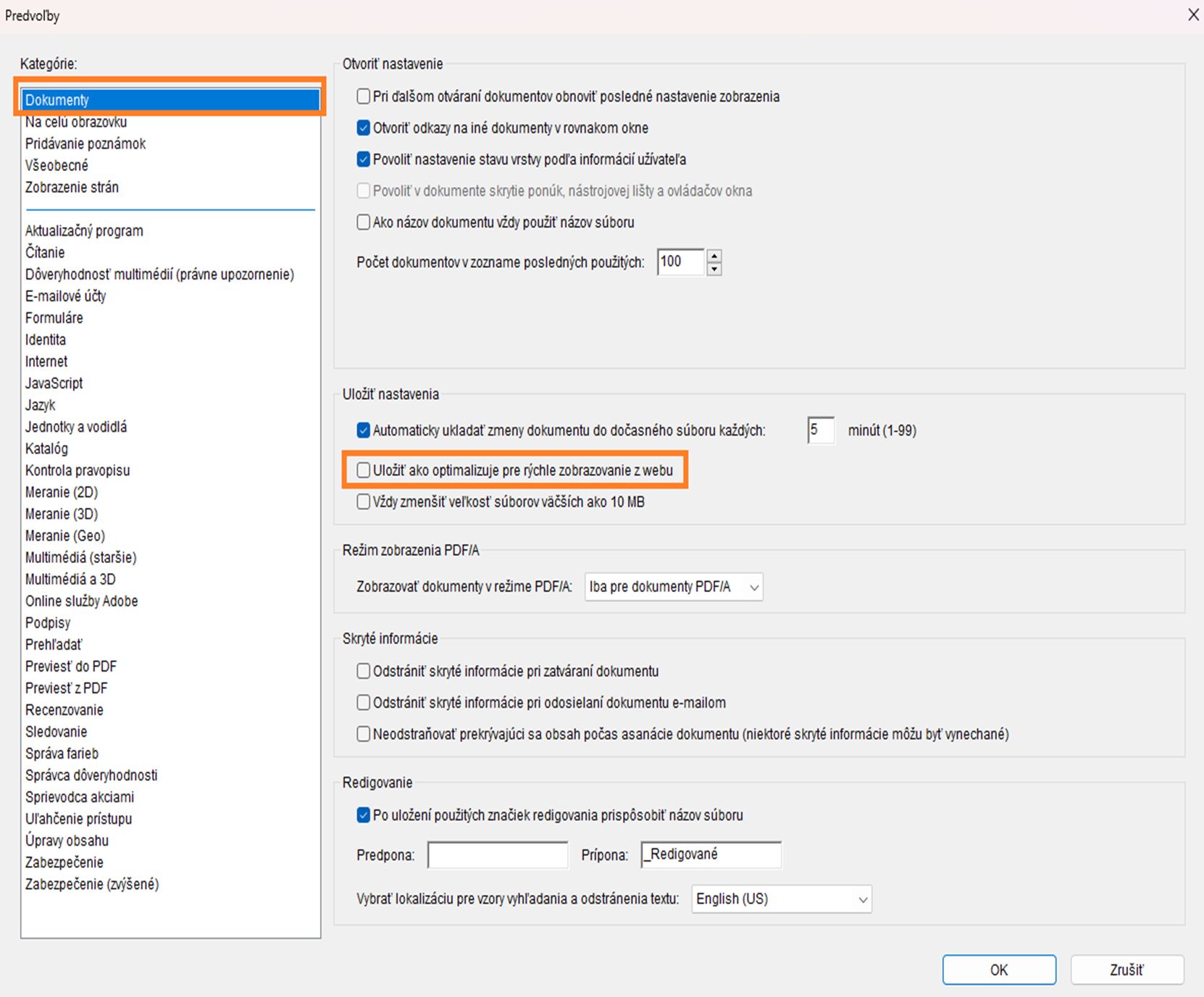 V zozname kategórií vyberte dokumenty a zrušte výber možnosti Uložiť ako optimalizáciu pre rýchle zobrazenie webu.