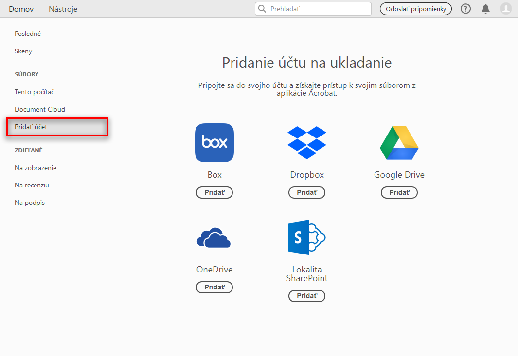 Aplikácie Acrobat a Acrobat Reader umožňujú otvárať a ukladať súbory do online služieb na správu súborov, ako sú napríklad služby Dropbox, Microsoft SharePoint, OneDrive, Box a Disk Google. K súborom PDF hosťovaným v týchto online službách môžete získať prístup prostredníctvom ich webového rozhrania alebo v aplikácii Adobe Acrobat alebo Adobe Acrobat Reader.