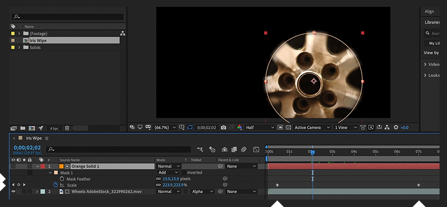 After the footage shows through the circle mask, keyframe the mask’s Scale (S) from zero to however large it needs to be to achieve the iris-opening speed you want. Increase the Mask Feather setting (F), depending on how soft you want the edge of the mask to appear.
