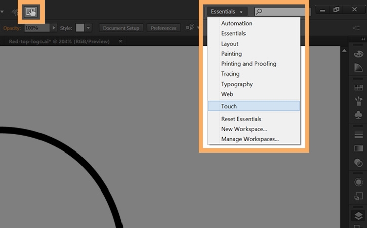 Two ways to access the Touch Workspace in Illustrator