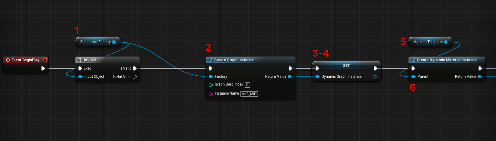 Set the variable for the dynamic substance material with the return value of the Create Graph Instance node.