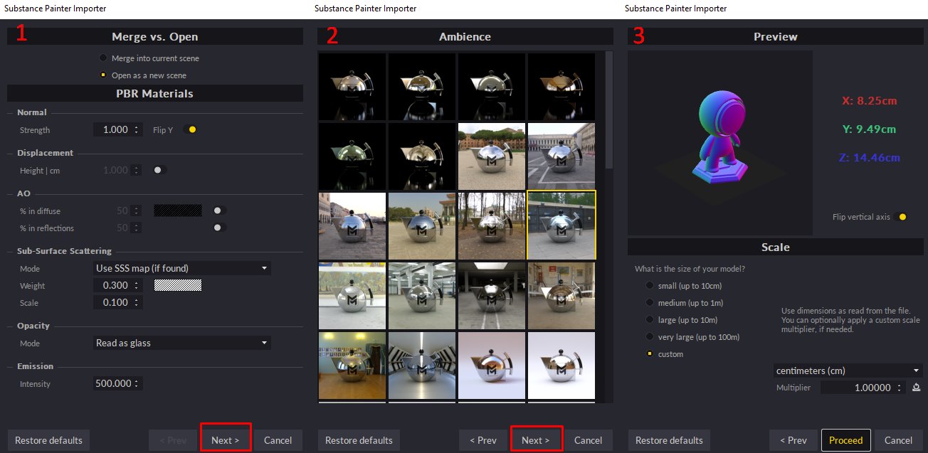 - In the third dialog page you can choose the scale and axis orientation of your model.