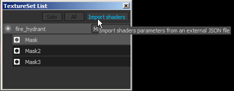 In this specific workflow the most important part are the mask and the shader parameters. Therefor in the export window of Substance 3D Painter it is recommended to enable the " Export shaders parameters " setting. This will create a JSON file on the disk next to the textures that will contains information about the sub-stacks setup, the materials used and the shaders and their parameters. Parameters Export and Import