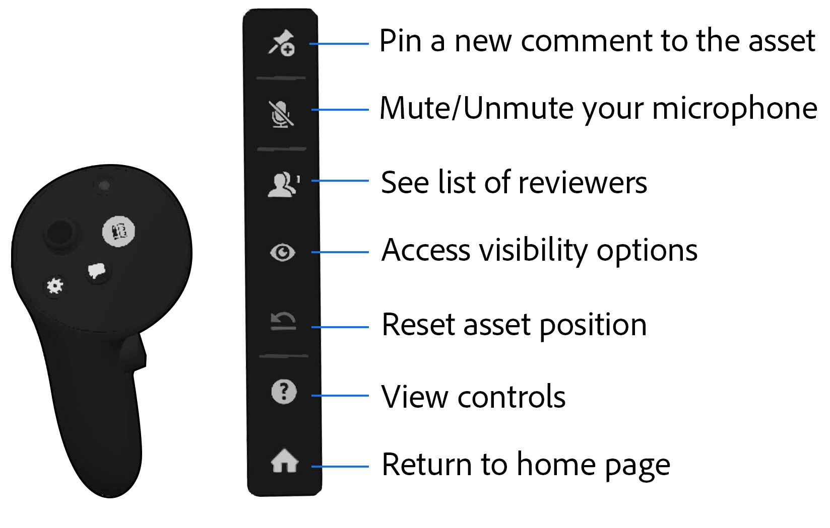 To pin a comment, select this option, then use the primary controller to place the pin on the asset. After placing the pin, the Comments panel will open where you can enter the text of the comment. - Mute/unmute microphone: