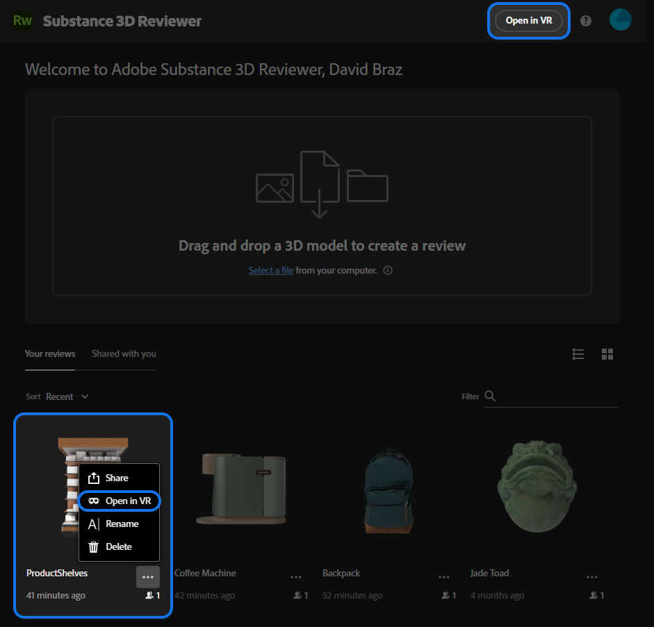 It's possible to open Reviewer in VR from desktop. To open Reviewer, use the Open in VR button in the Top Bar or, from the options for a specific review, use Open in VR to launch that review directly in VR. This makes it easy to quickly transition from desktop to VR reviews.