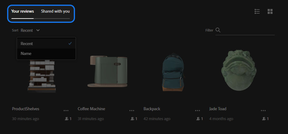 Substance 3D Reviewer gives you the ability to review models that you have uploaded, or that have been shared with you. On the Reviewer home page, you’ll be able to see all of the reviews available to you: