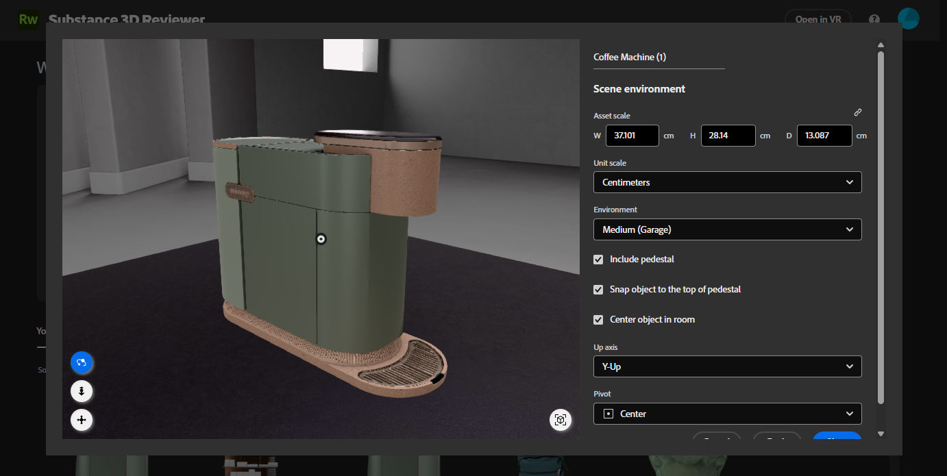 On this screen you can adjust the model’s size and position in the scene, and change which environment will be used in the Review. Use the controls to: