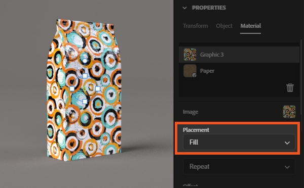 Fill mode will set the image to use the models original UVs from 0-1 space. Fill mode is best if you've designed the image for the models UVs (using the UV export feature or another texturing app such as Substance 3D Painter). Fill mode also works great for repeating pattern textures.