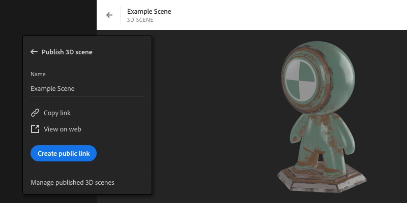 To manage your published scenes visit Creative Cloud Files on the web and open the “Published” tab to find your published scenes.