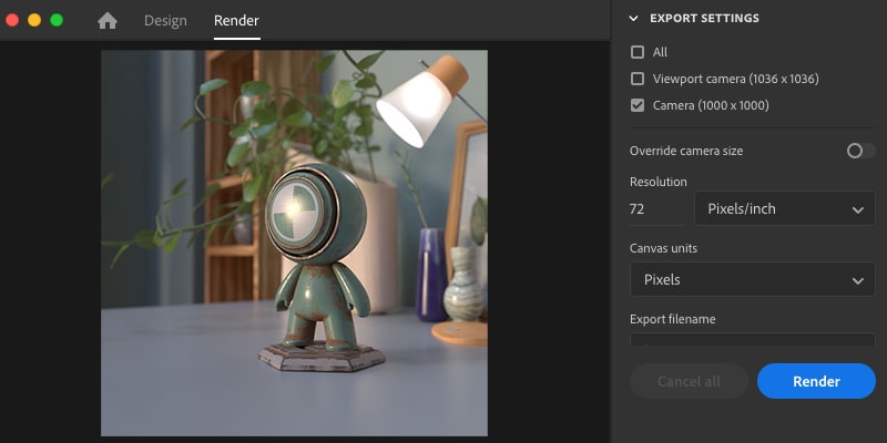 Render mode is where you can export final quality rendered images.
