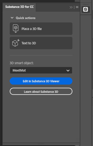 In Photoshop, open the Substance 3D panel to directly access Substance 3D Viewer functionality. While you have a 3D Smart Object selected, you can also use the Edit in Substance 3D Viewer button to open the object in Viewer and make changes to the render.