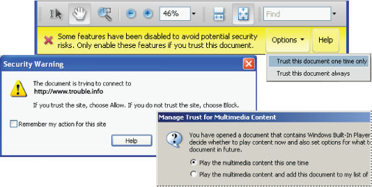You may be viewing this page because you clicked the Help button in a security warning. Security warnings in PDFs come in many forms. Three are shown below.