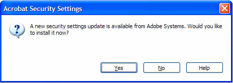 The Security Settings alert (shown below) contains Yes and No buttons. Reader and Acrobat use security settings to verify digital signatures. Click Yes to update the security settings. See the article Adobe Approved Trust List (AATL) for more information.