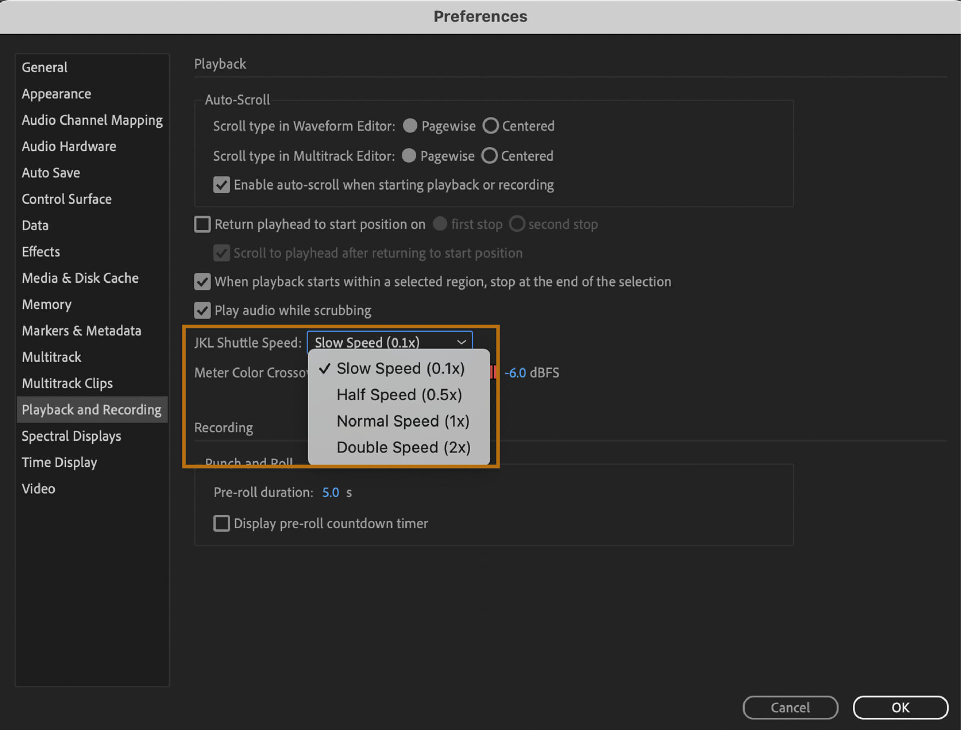 Play your audio at a custom speed of 1.1x, 1.2x, etc. Use JKL Shuttle Speed to adjust the customized playback speed.