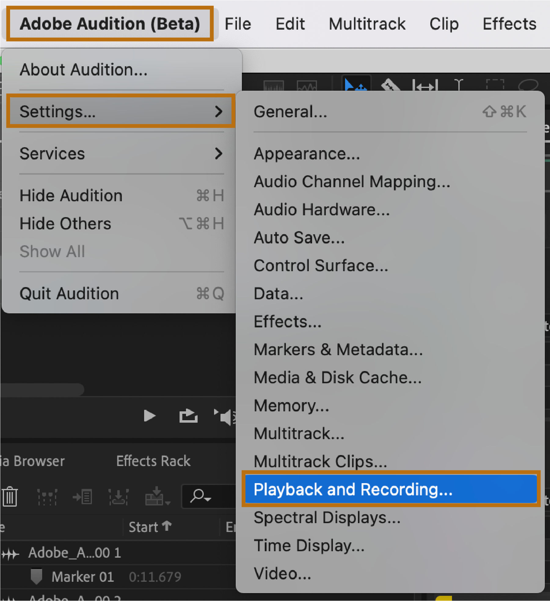 1. Select Adobe Audition > Settings > Playback and Recording .