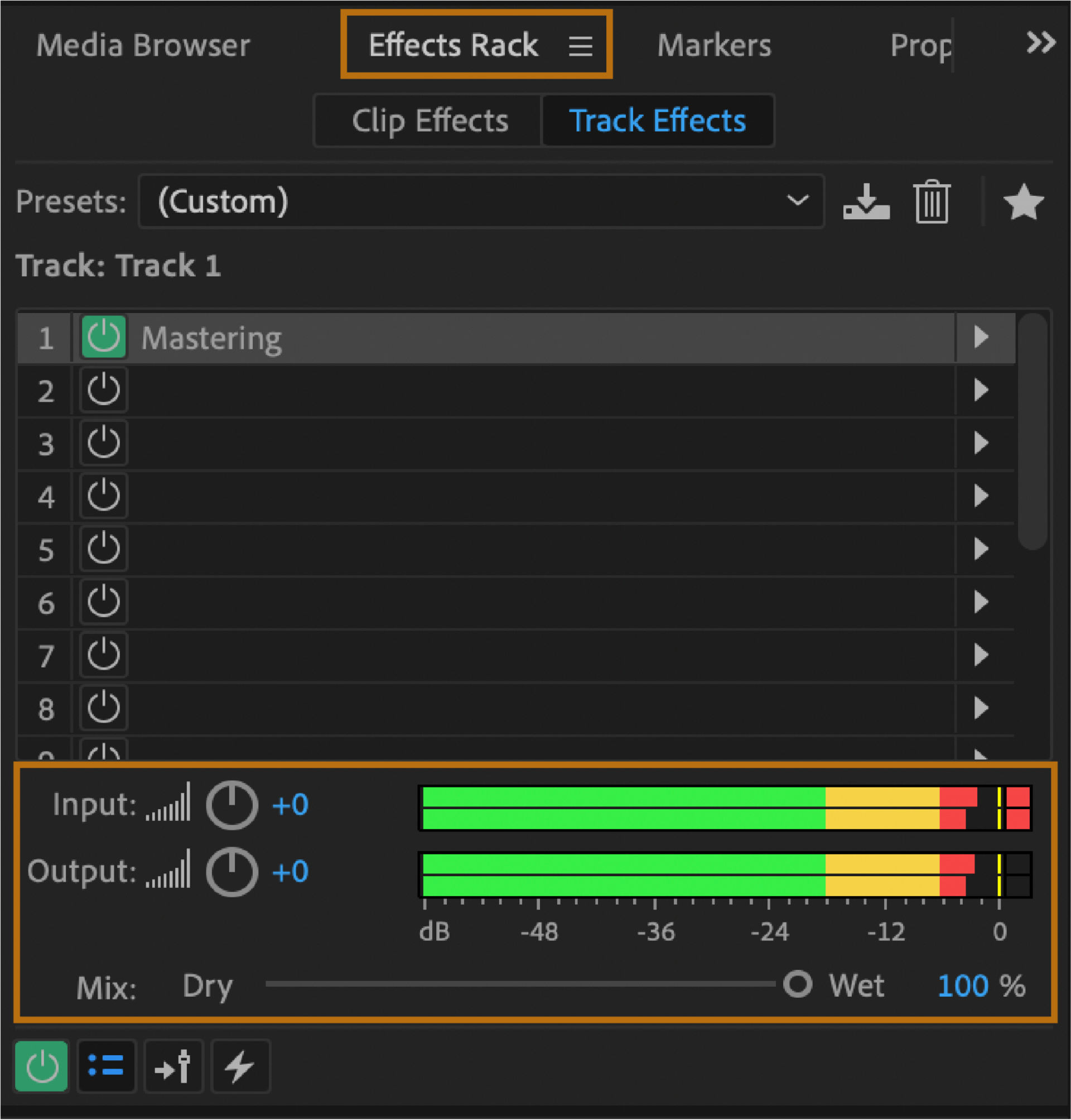 In the Effects Rack, the two-level meters display the signal level of the Input (the clips and tracks being routed through those effects) and the Output (the signal level leaving the effects chain).