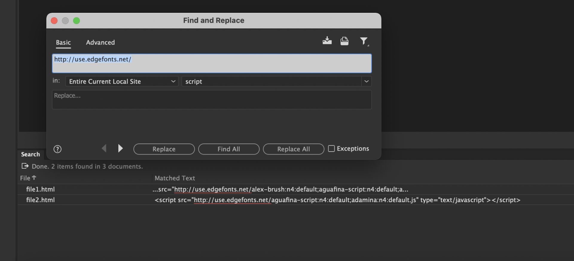 Click Find > Find and Replace in Files > Basic > Enter text http://use.edgefonts.net/ in Find textbox > Set [any tag] to script > Select Entire Current Local Site or other option in the drop-down > Click Find All