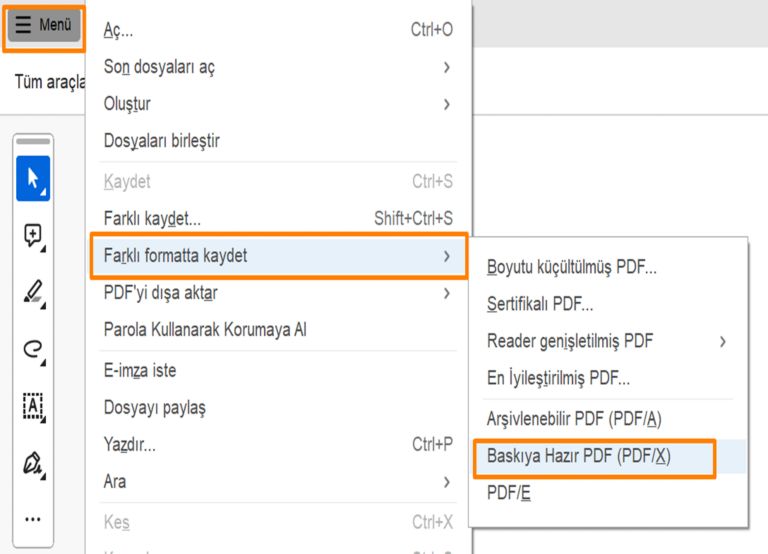 PDF'yi Acrobat'ta açın ve hamburger menüyü (Windows) veya Dosya menüsü (macOS) > Farklı Kaydet > Baskıya hazır PDF (PDF/X) seçeneğini belirleyin.
