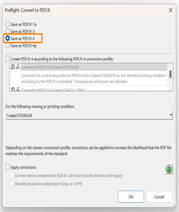 Not:Aşağıdaki PDF/X-4 dönüştürme profiline göre PDF/X-4 oluştur bölümünde listelenen geçerli PDF/X-4 dönüştürme profillerini seçebilir ve gereksinimlerinize göre Düzeltmeleri uygulayabilirsiniz.
