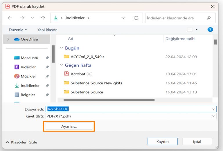 Farklı Kaydet iletişim kutusunda Ayarlar'ı seçin.