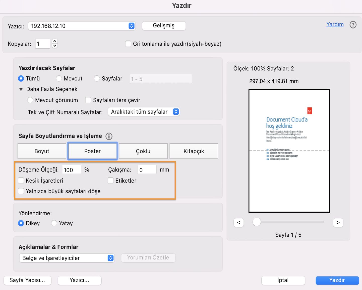 Yazdır iletişim kutusunun Sayfa Boyutlandırma ve İşleme bölümünde Poster'i seçin.
