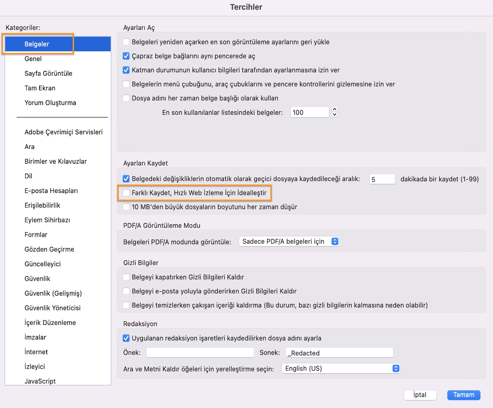 Kategoriler listesinden Belgeler'i seçin, ardından Hızlı Web Görünümü İçin En İyileştirenler olarak Kaydet seçeneğinin işaretini kaldırın.