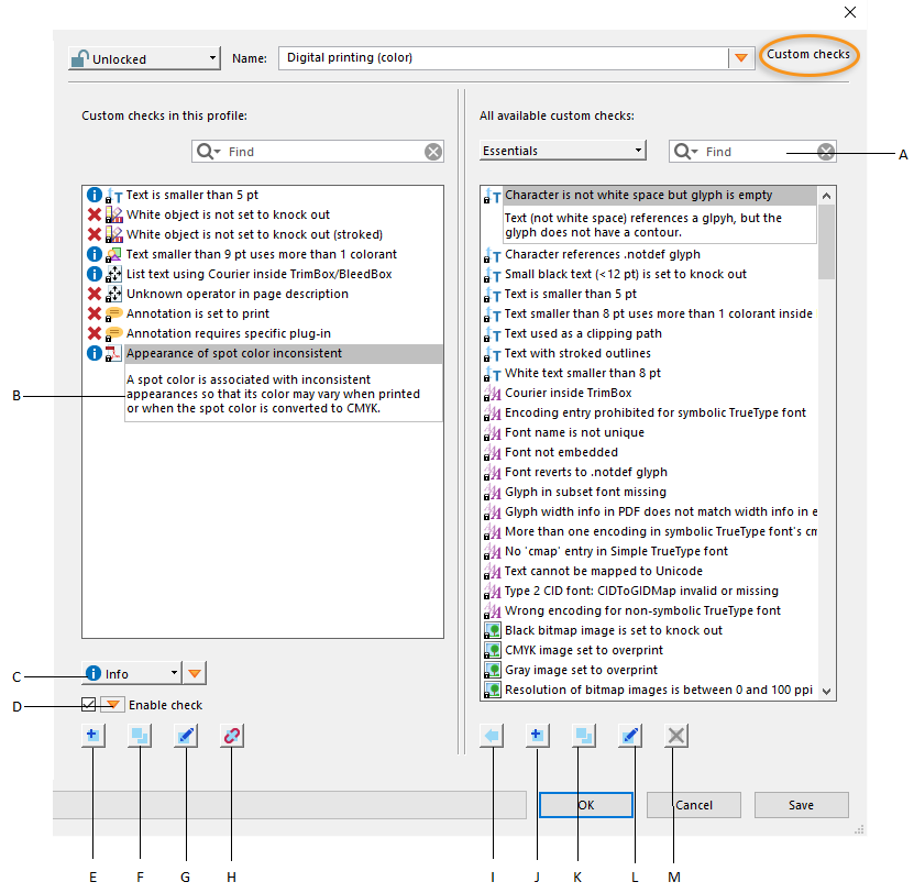 Ön Kontrol aracı, bir profile ekleyebileceğiniz ek denetimlerden (Acrobat uygulamasının daha önceki sürümlerinde kurallar adı verilirdi) oluşan bir koleksiyon içerir. Bu denetimler, her profilde bulunan Özelleştirilmiş Denetimler bölümünden kullanılabilir. Bu denetimler üzerinde, tanımladıkları PDF özelliğine bağlı olarak çeşitli şekillerde değişiklik yapabilirsiniz. Profilin parçası olmadan hemen çalışan tekli denetimler de oluşturabilirsiniz. Tekli denetimler çalışırsa sonuçlardaki işaretli içerik hata olarak görüntülenir.