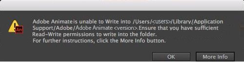 Doğru çalışma için Animate , uygulamaya özgü dosyaları veya bilgileri kullanıcı klasörlerine yazar. Animate CC'nin yazmaya çalıştığı klasörlere yazma izniniz yoksa bir hata mesajı görüntülenir.