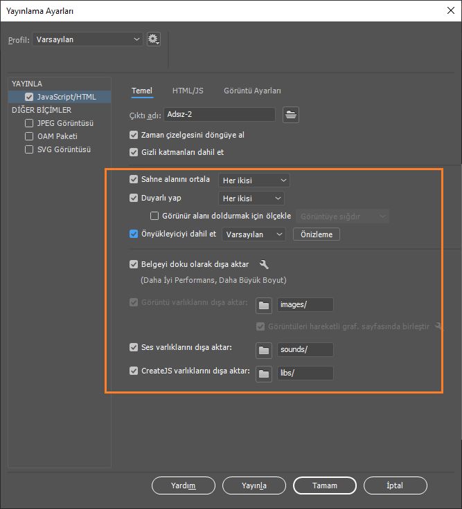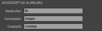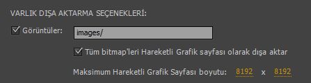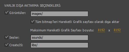 - Görüntüler, sesler gibi varlık dışa aktarma seçeneklerinin işaretlerini kaldırarak varlıkları FLA'dan dışa aktarmamayı seçme ve CreateJS JavaScript kitaplıklarını destekleme ve dışa aktarmak üzere ilgili URL'leri kullanma.