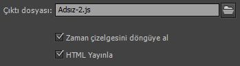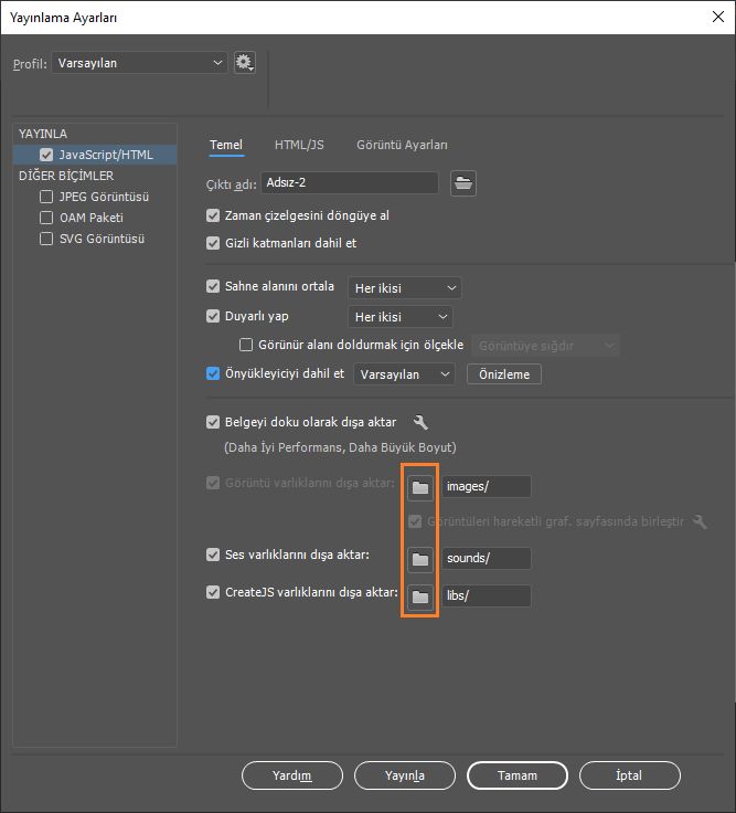 Bu dosyalar varsayılan olarak FLA ile aynı konuma kopyalanır. Yayınlama Ayarları iletişim kutusunda çıktı yolunu belirleyerek bu konumu değiştirebilirsiniz (Dosya > Yayınlama Ayarları).