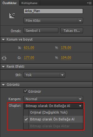 Bir movieclip sembolü için Bitmap olarak önbelleğe al özelliğini etkinleştirmek üzere, movieclip örneğini seçin ve Özellik Denetçisi'nde (Pencere > Özellikler) Oluştur açılır menüsündeki Bitmap olarak önbelleğe al seçeneğini belirleyin.