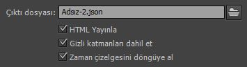 WebGL çıktısındaki tüm gizli katmanları dahil eder. Gizli Katmanları Dahil Et'in seçimini kaldırma, film kliplerinin içinde yuvalanmış katmanlar dahil, gizli olarak işaretlenmiş tüm katmanların oluşturulan WebGL'ye dışa aktarılmasını engeller. Bu sayede katmanları görünmez yaparak WebGL belgesinin farklı sürümlerini kolayca test edebilirsiniz.