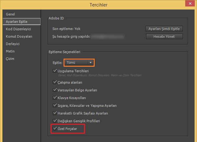 Oluşturduğunuz özel fırçalar, Animate tercihleri aracılığıyla buluta senkronize edilebilir. Bunun için Windows'ta Düzen > Tercihler veya Mac'te Animate > Tercihler'i seçin. "Eşitleme Ayarları" bölümünde özel fırçaları senkronize etme seçeneği aşağıda gösterilmektedir: