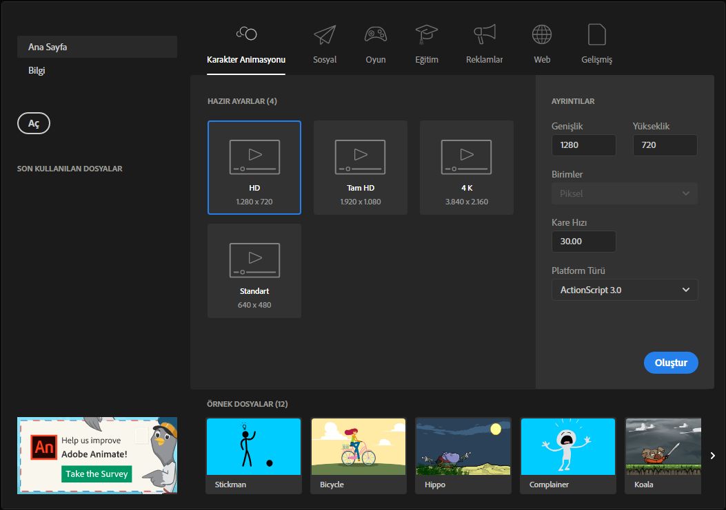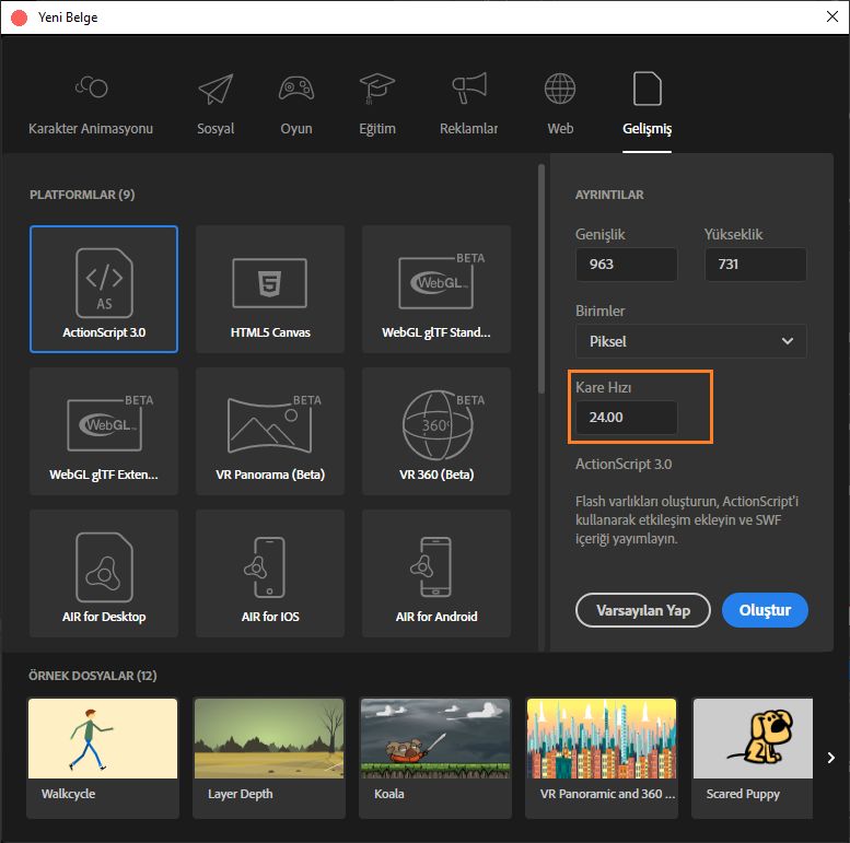 2. Animate projelerini diğer belge türü biçimlerine dönüştürme