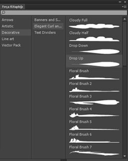 Animate, geniş bir Resim ve Desen fırçaları koleksiyonu içeren entegre bir küresel Vektör Fırçaları kitaplığına sahiptir. Fırça Kitaplığı Panelini başlatmak için Pencereler > Fırça Kitaplığı seçeneğini belirleyin veya Özellik Denetçisi'nde Fırça simgesini tıklatın. Herhangi bir fırçayı kullanmadan önce geçerli dosyanıza eklemek için fırçayı çift tıklatın.