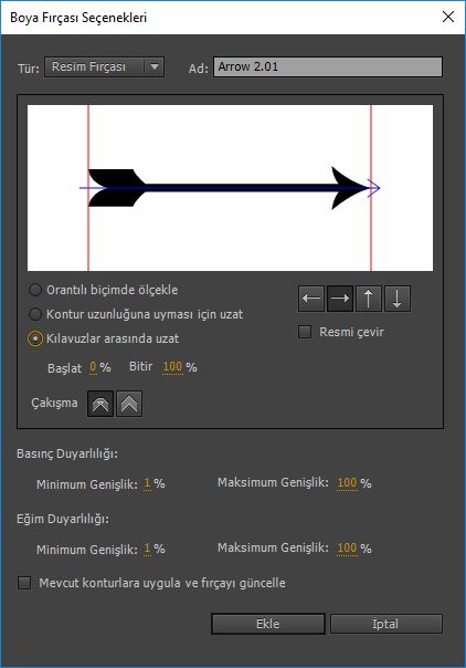 Fırça Düzenleme simgesi, seçili fırça için Fırça düzenleme iletişim kutusunu açar. Düzenleme için bir Resim Fırçası seçerseniz Resim Fırçası Seçenekleri iletişim kutusu görünür. Fırça yönü, ölçekleme tercihleri ve çakışma tercihleri gibi özellikleri değiştirebilir ve değişiklikleri varolan konturlara uygulayabilirsiniz.