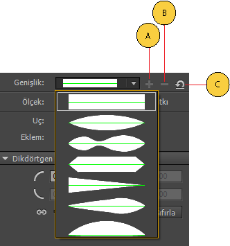 Genişlik profilini kaydet seçeneği yalnızca sahne alanında varsayılan genişlik profillerinden ayrı değişken genişlik seçildiğinde etkindir. Genişlik aracını kullanarak kendi kontur profillerinizi oluşturabilir ve kaydedebilirsiniz. Benzer şekilde, genişlik profilini sil simgesi açılır menüde özel genişlik profili seçili olduğunda etkindir. Herhangi bir özel profili silmek istiyorsanız bu seçeneği kullanabilirsiniz.