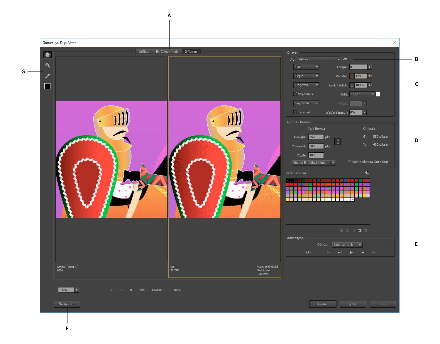 A. Görüntü seçenekleri B. En İyileştir açılır menüsü C. Önayar seçenekleri D. Görüntü boyutu seçenekleri E. Animasyon seçenekleri F. Önizleme G. Araç çubukları