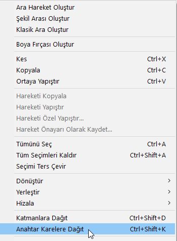 Sahne alanındaki herhangi bir yeri sağ tıklatın ve Anahtar Karelere Dağıt seçeneğini belirleyin.