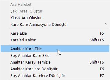 - Yeni bir anahtar kare oluşturmak için Ekle > Zaman Çizelgesi > Anahtar Kare (F6) seçeneğini belirleyin veya anahtar kareyi yerleştirmek istediğiniz kareyi sağ tıklatın (Windows) ya da Control tuşuna basıp tıklatın (Macintosh) ve bağlam menüsünden Anahtar Kare Ekle'yi seçin.
