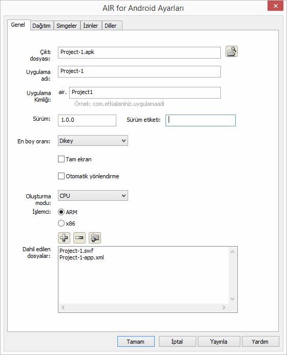 İşlemci: Uygulamayı yayınladığınız cihazlar için işlemci türünü seçmenize olanak tanır. Desteklenen işlemci türleri ARM ve Intel x86 şeklindedir. X86 işlemciler için destek, Animate 2014.1 sürümünden itibaren sağlanmaktadır.