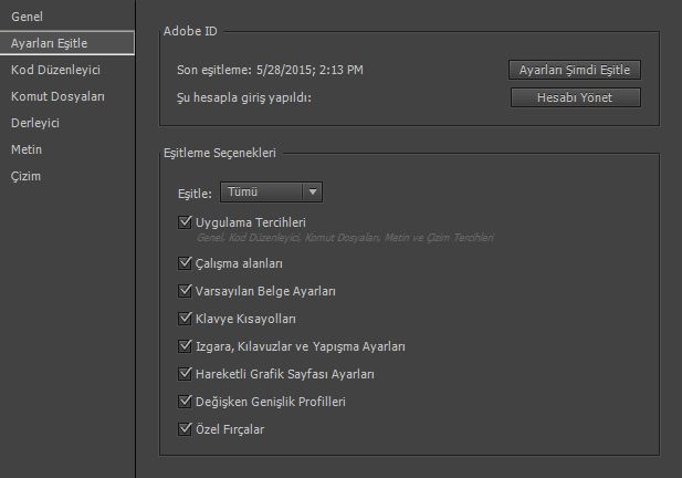 - Ayarlarınızı Creative Cloud ayarlarınızla senkronize etmek için Ayarları Şimdi Eşitle'yi tıklatın.