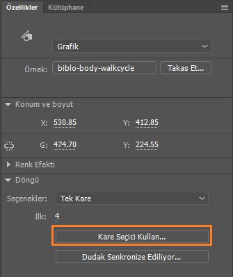 Grafik sembolü seçin ve ardından Özellikler Paneli > Döngü > Kare Seçiciyi Kullan.. düğmesini tıklayıp Kare Seçici panelini görüntüleyin veya Pencere >Kare Seçici seçeneklerini belirleyin.