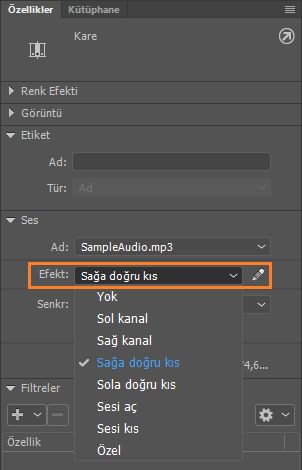 Animate, özellik denetçisinde ses senkronizasyon seçeneklerini hatırlar. Özellik Denetçisi'nin "Ses" bölümünden bir ses seçildikten sonra Özellik Denetçisi'nden yeni bir anahtar karede başka bir ses ayarlanmaya çalışılırsa Animate, önceki sesin "Akış" veya "Olay" senkronizasyon seçeneklerini hatırlar.